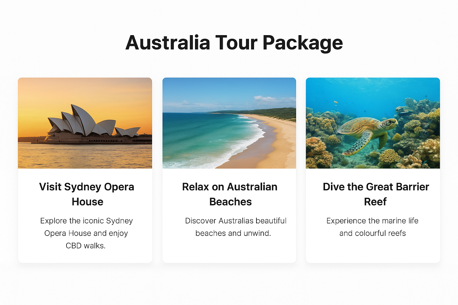 Experience Australia’s top attractions with our curated tour—Sydney Opera House, Gold Coast beaches and the Great Barrier Reef. Enjoy guided sightseeing, comfortable hotels and thrilling adventures. Perfect for families, couples and solo travelers looking for a memorable getaway.